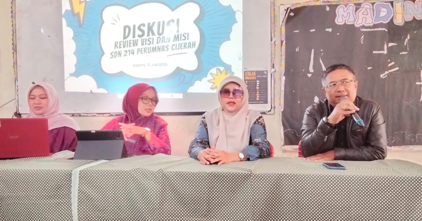 Pengawas satuan pendidikan SDN 214 Euis Nurhayati, S.Pd.AUD., M.Pd., dalam sambutannya sekaligus membuka Diskusi Review Visi dan Misi SDN 214 Perumnas Cijerah, menyampaikan bahwa visi dan misi sebagai jargon satuan pendidikan guna menjual produk sekaligus sebagai iklan yang harus diketahui oleh seluruh civitas akademika SDN 214 Perumnas Cijerah baik pendidik dan tenaga kependidikan, orang tua siswa serta masyarakat. Visi dan misi harus sesuai dengan kemampuan satuan pendidikan agar semuanya bisa terlaksana dan diimplementasikan, tutur Euis Nurhayati.